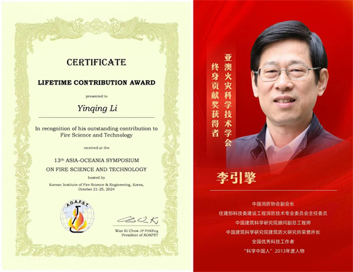 中國消防協(xié)會(huì )副會(huì )長(cháng)、中國建研院顧問(wèn)副總工程師李引擎在2024年10月韓國大邱舉辦的“第十三屆亞澳火災科學(xué)技術(shù)大會(huì )”上榮獲“亞澳火災科學(xué)技術(shù)學(xué)會(huì )終身貢獻獎”,以表彰他為消防安全科學(xué)和工程發(fā)展推廣做出的卓著(zhù)貢獻。