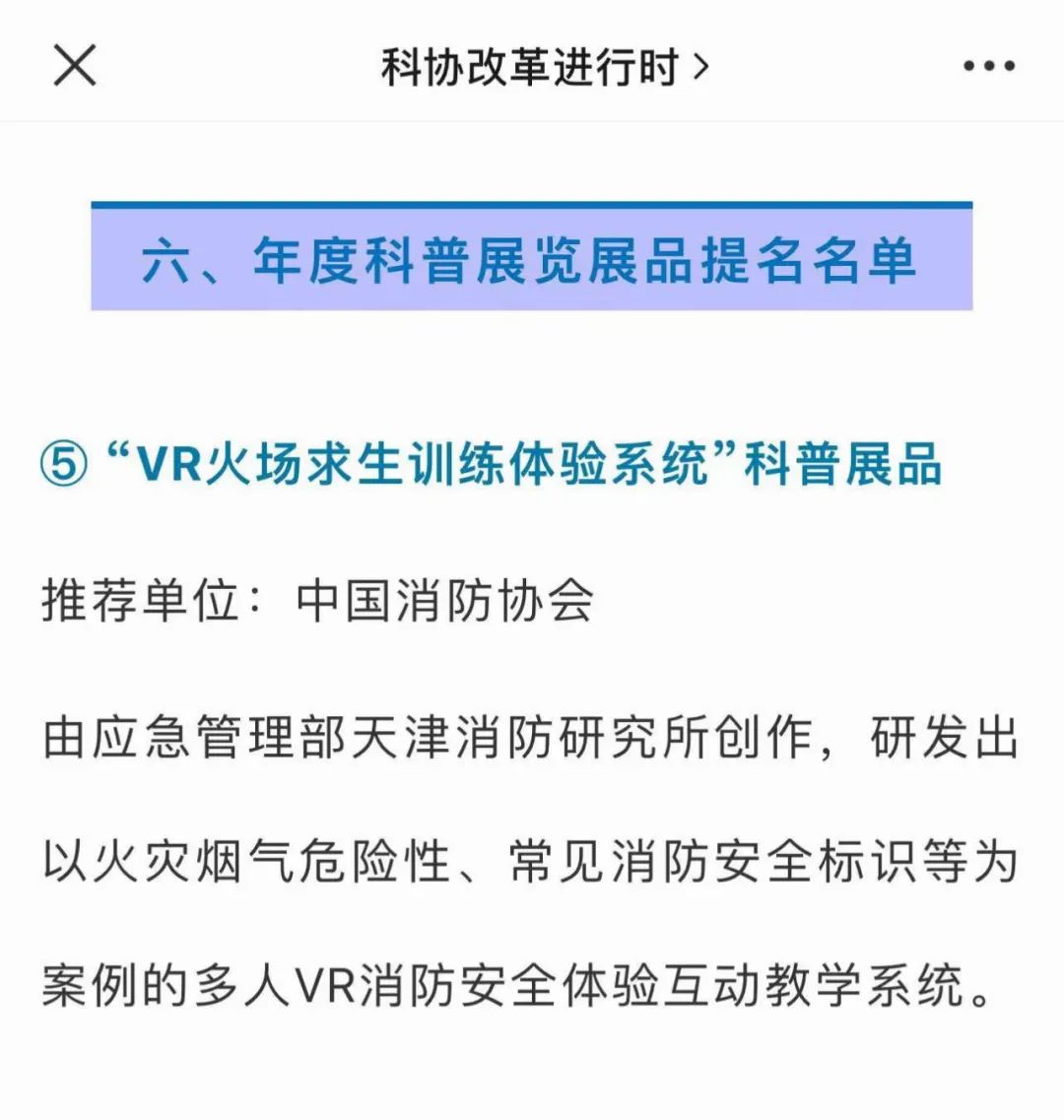 按照中國科協(xié)辦公廳《關(guān)于開(kāi)展“典贊·2021科普中國”活動(dòng)的通知》要求,我會(huì )領(lǐng)導高度重視,精心部署,認真做好組織動(dòng)員、申報等工作。中國消防協(xié)會(huì )推薦的年度科普展覽展品“VR火場(chǎng)求生訓練體驗系統”在全國各省、市科協(xié),全國各學(xué)會(huì )推薦的展品中榮獲中國科協(xié)“典贊·2021科普中國”提名。
