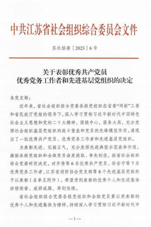 近日,中共江蘇省社會(huì )組織綜合委員會(huì )印發(fā)《關(guān)于表彰優(yōu)秀共產(chǎn)黨員優(yōu)秀黨務(wù)工作者和先進(jìn)基層黨組織的決定》,江蘇省消防協(xié)會(huì )黨支部榮獲“先進(jìn)基層黨組織”稱(chēng)號,協(xié)會(huì )黨支部書(shū)記、會(huì )長(cháng)蔣正林同志被授予“優(yōu)秀黨務(wù)工作者”稱(chēng)號,協(xié)會(huì )秘書(shū)高亞嵐同志被授予“優(yōu)秀共產(chǎn)黨員”稱(chēng)號。