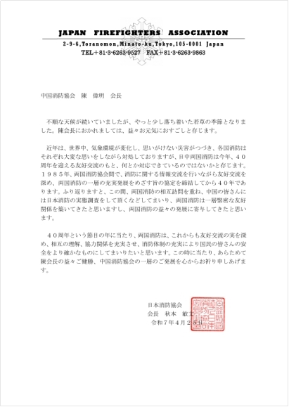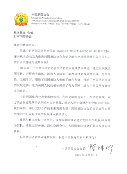 2025年4月25日,在中日兩國消防協(xié)會(huì )簽訂《結成友好協(xié)會(huì )關(guān)系議定書(shū)》40周年之際,中國消防協(xié)會(huì )會(huì )長(cháng)陳偉明與日本消防協(xié)會(huì )會(huì )長(cháng)秋本敏文互致賀信,慶祝兩會(huì )建立友好關(guān)系40周年 。