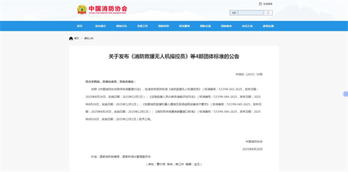 2025年8月26日,中國消防協(xié)會(huì )批準發(fā)布《消防救援無(wú)人機操控員》(T/CFPA 043—2025)團體標準。該標準是我國消防救援無(wú)人機領(lǐng)域的首部職業(yè)技能規范,構建了初、中、高三級職業(yè)能力體系,明確了七大應用場(chǎng)景的技術(shù)要求,將顯著(zhù)提升復雜災害現場(chǎng)的救援能力。
