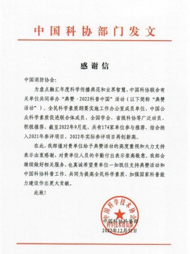 中國科協(xié)就“典贊•2022科普中國”活動(dòng)向中國消防協(xié)會(huì )致感謝信