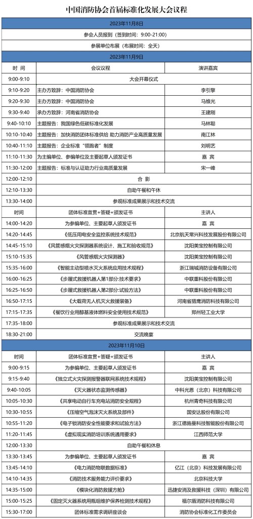 2023年11月9日-10日,“首屆消防標準化發(fā)展大會(huì )”將在河南省鄭州市-紫荊山賓館召開(kāi),大會(huì )由中國消防協(xié)會(huì )主辦,河南省消防協(xié)會(huì )承辦,會(huì )議采取政策宣講、主旨演講、展覽展示、標準宣貫、頒證儀式、交流晚宴、團體標準需求調研座談等形式召開(kāi)。