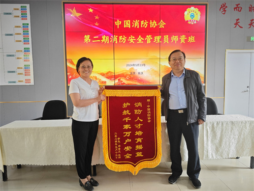 5月16日,中國消防協(xié)會(huì )收到了一份特別的禮物,第二期消防安全管理員培訓班學(xué)員代表鄧淦元贈送了一面寫(xiě)有“消防人才培育搖籃,護航千家萬(wàn)戶(hù)安全”的錦旗。